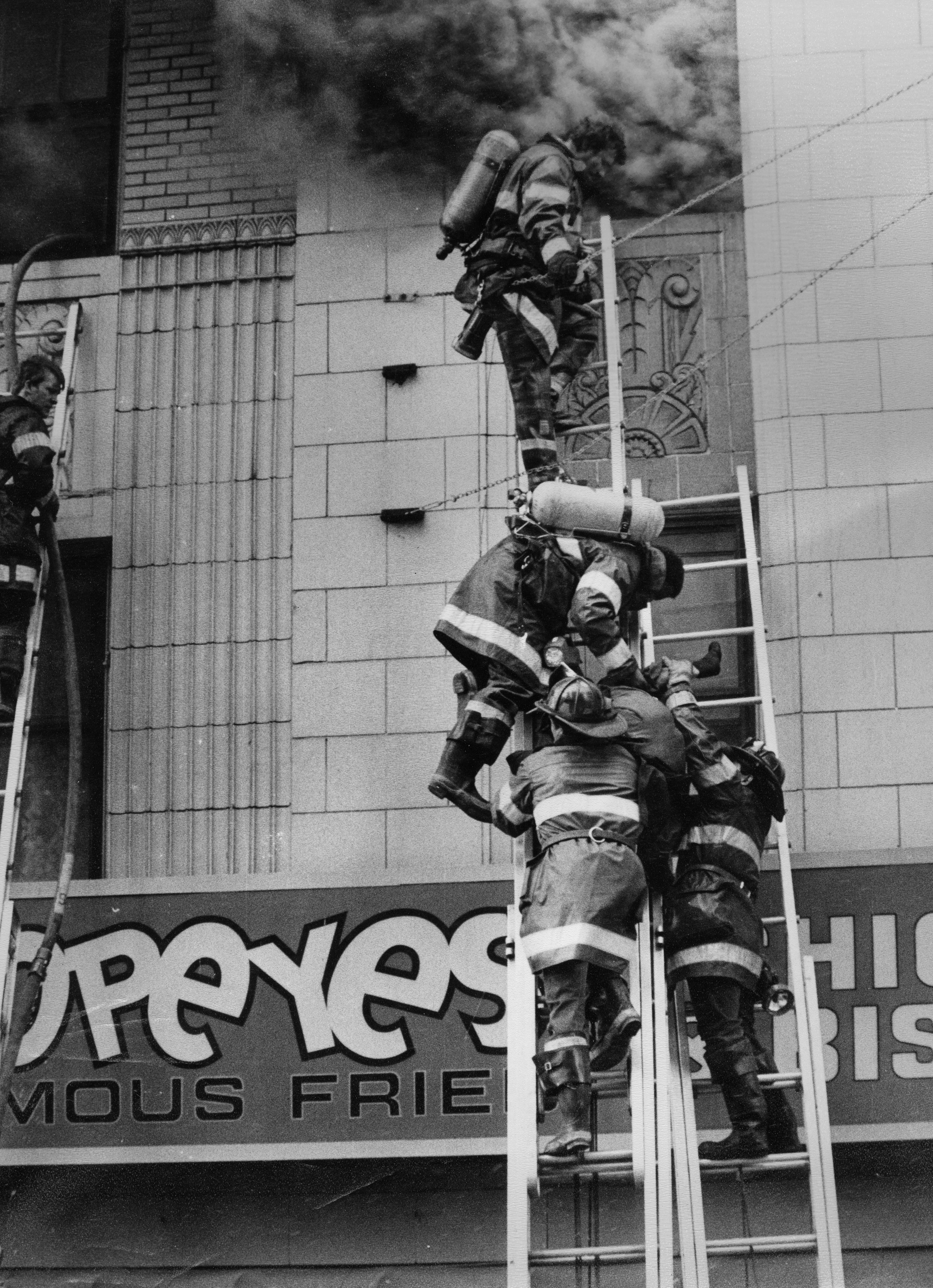 | Description: | This photograph shows firefighters carrying a resident down a ladder outside the Mark Twain Hotel where Chicago Fire Department Lieutenant Edmond Coglianese died in the line of duty in 1986. |