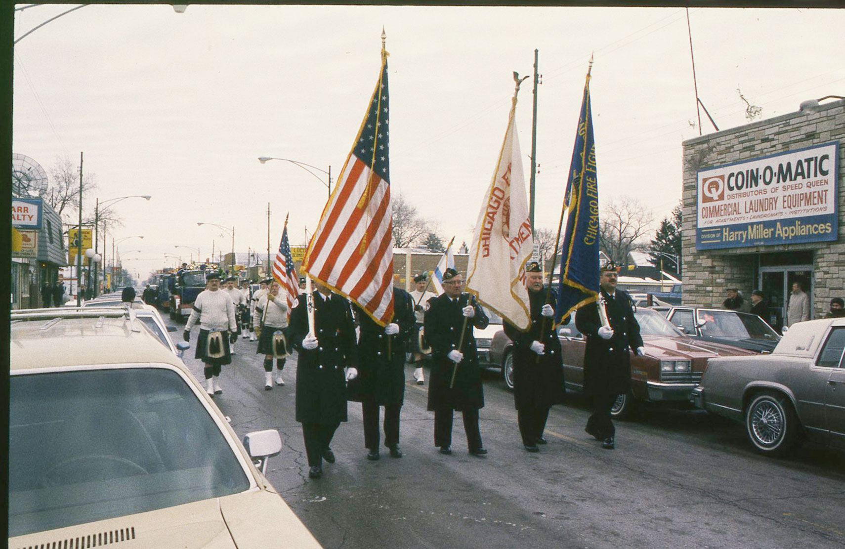 | Description: | This photograph shows uniformed participants holding flags and multiple pieces of fire apparatus decorated with bunting and flowers participating in the procession of Chicago Fire Department Lieutenant Edmond Coglianese who died in the line of duty in 1986. |